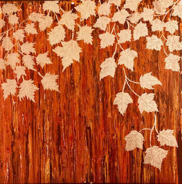 This work tries to incorporate all the fall colours with fluid acrylics in the background, with the grace of the maple leaves in gold in the foreground.